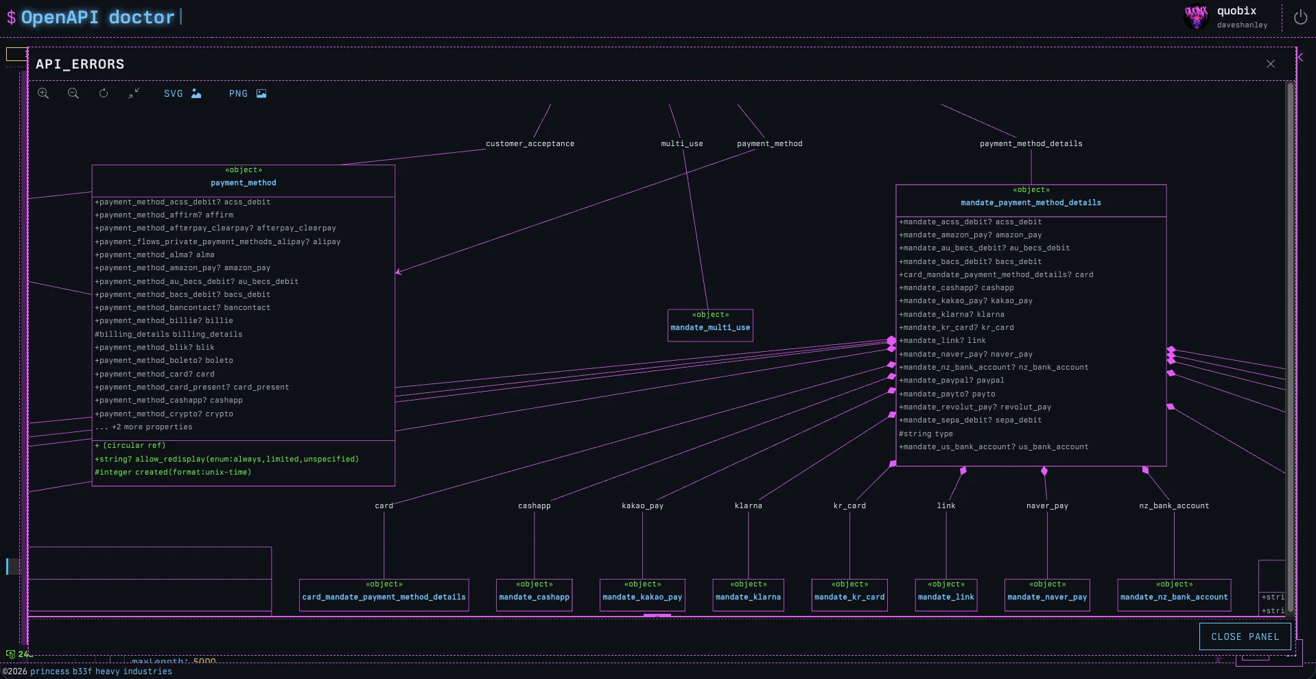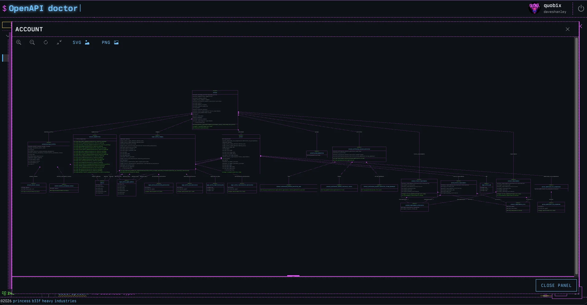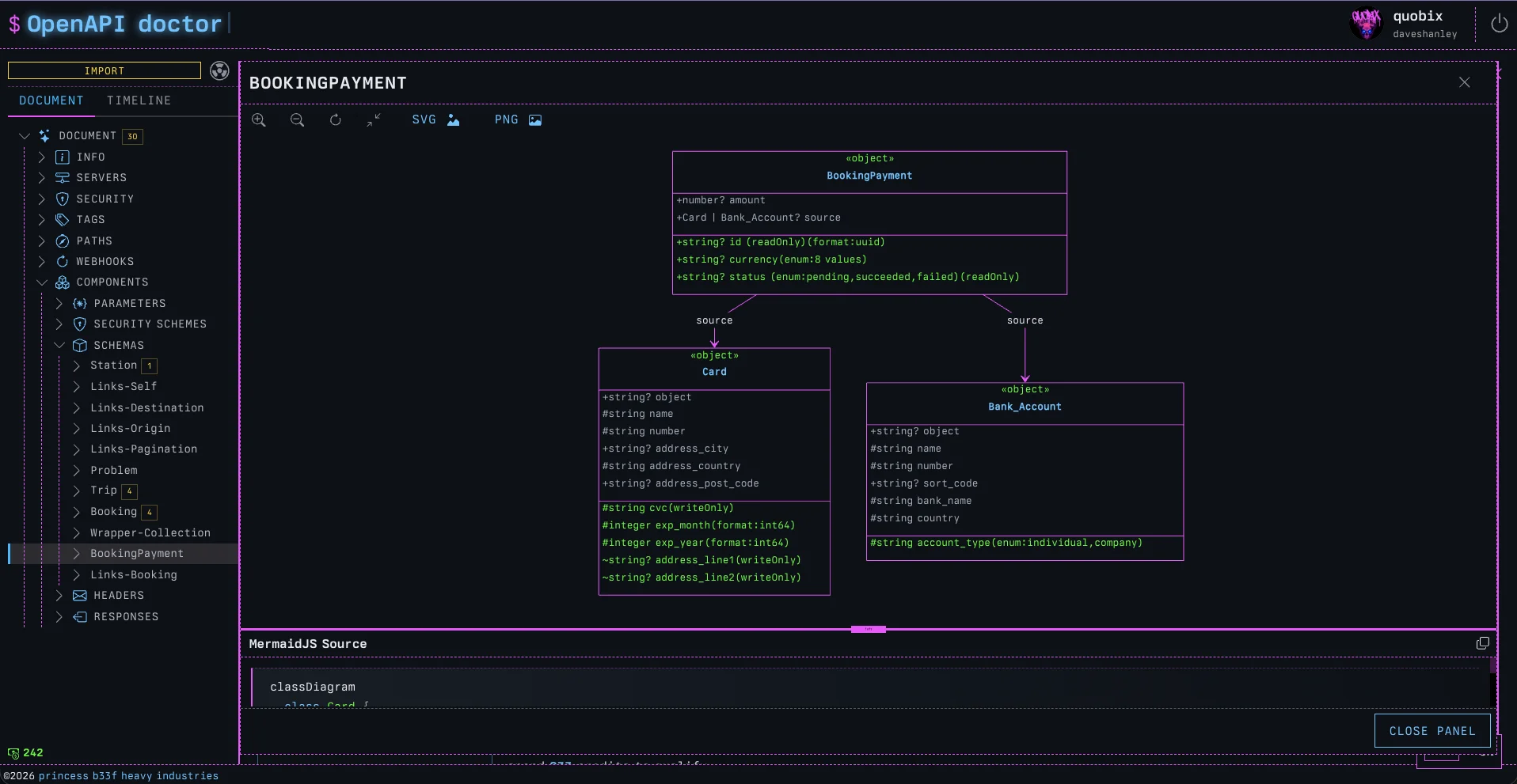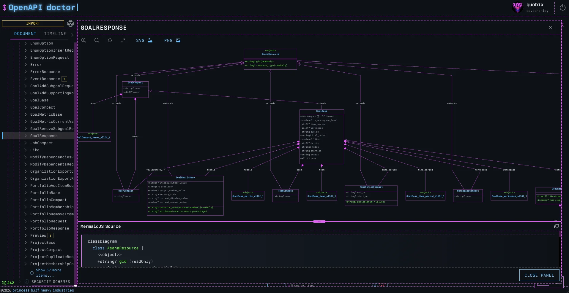 Now, when viewing any Schema in the doctor, we can click on ‘DIAGRAMIFY’ and a fully rendered MermaidJS class diagram will slide out, complete with the source, so we can copy it into our own custom Mermaid diagrams.