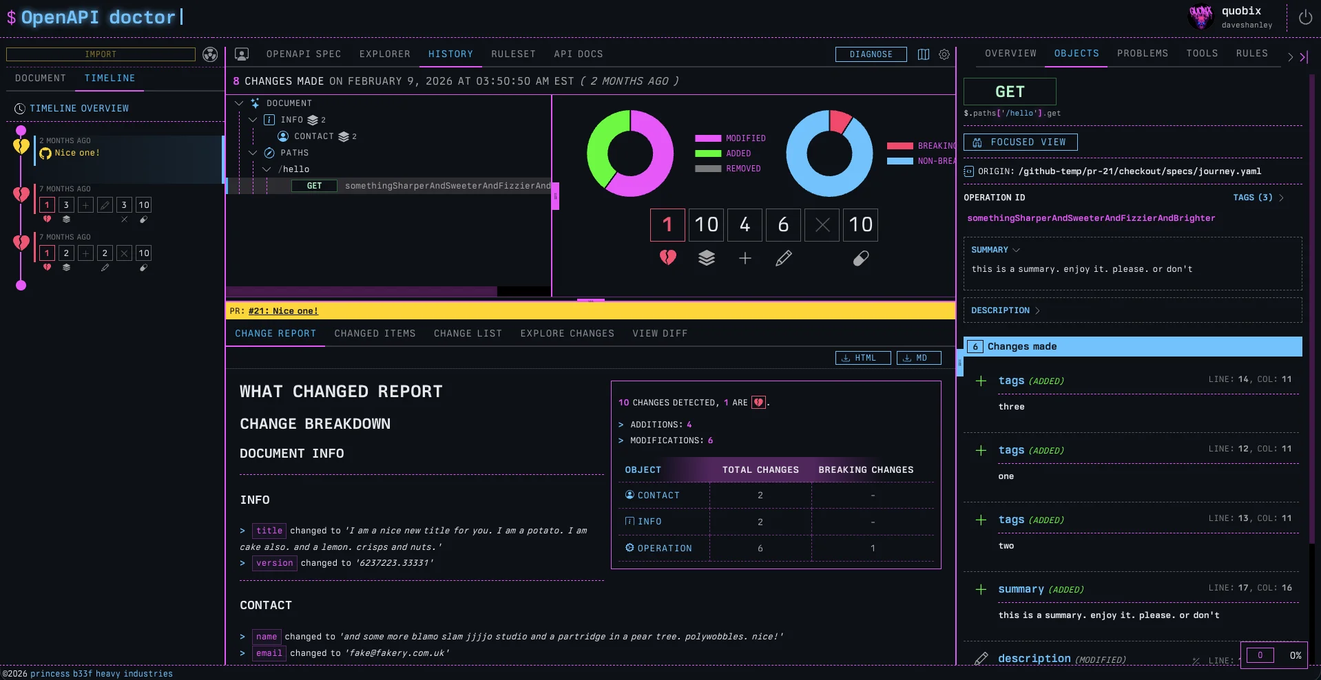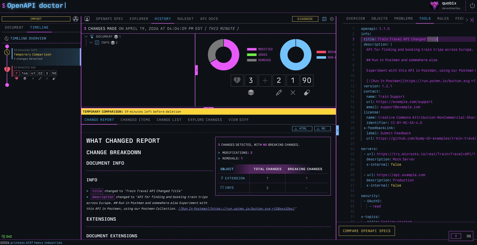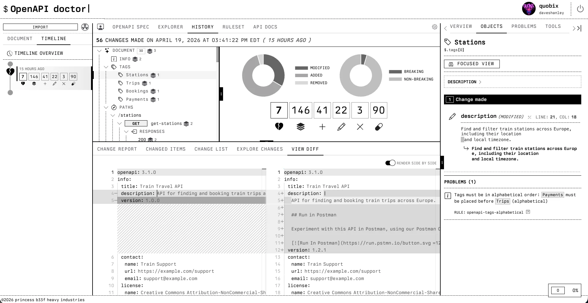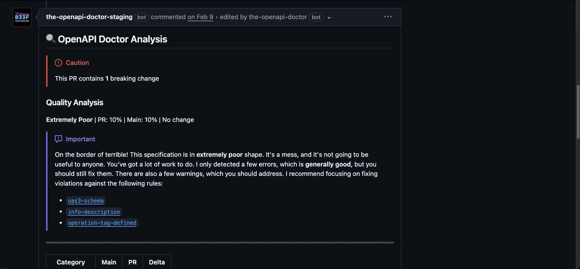 Any time anyone pushes a PR for review, the OpenAPI Doctor will review the changed specification files, lint the entire project, and then build a report outlining the quality score, how it went up or down, violations in linting rules, as well as a full changelog report of all the changes, and how many of them are breaking.